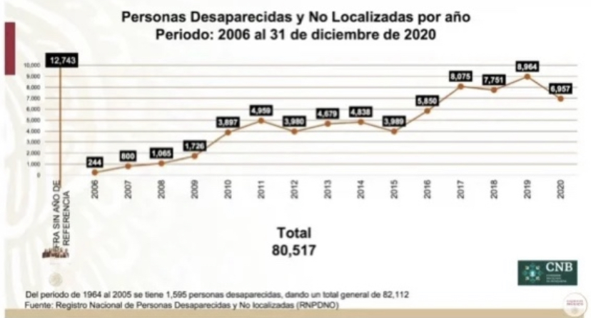 “En el periodo de 2006 a diciembre del 2020 tenemos ubicadas 80 mil 517 denuncias de personas desaparecidas o no localizadas y es un dato que se actualiza prácticamente varias veces al día y el día de hoy, el dato de día hoy a las 5:00 de la mañana es de 80 mil 888 denuncias de personas desaparecidas y se mantiene una tendencia del incremento de estas denuncias”, dijo.