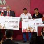 En conferencia en Palacio Nacional, el presidente otorgó a dos cheques equivalentes a 12 millones 836 mil 697 pesos, cada uno, con la finalidad de que el dinero sea ocupado en estas comunidades de escasos recursos.