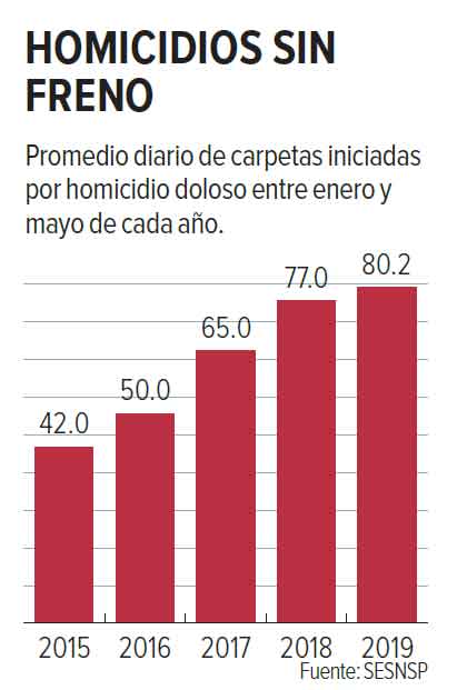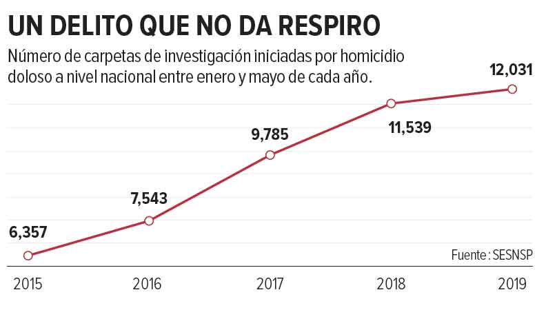 Cifras oficiales reportan un incremento nacional en el índice delictivo de 12.3% entre enero y mayo de este año, pues mientras 2019 empezó con 160 mil 521 carpetas, el mes pasado fueron 180 mil 387, la cifra más alta en la historia del país.
