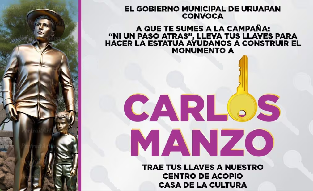 El Gobierno Municipal de Uruapan invitó a la población a donar llaves para elaborar un monumento en honor a Carlos Alberto Manzo Rodríguez, presidente municipal de esta ciudad, quien fue asesinado el pasado 1 de noviembre cuando se inauguraba el Festival de las Velas.