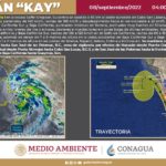 En su más reciente comunicado, la Coordinación Nacional de Protección Civil (CNPC) precisó que Kay se debilitó a categoría 1 y esta noche se encuentra a 115 kilómetros de Cabo San Lázaro, en Baja California Sur.