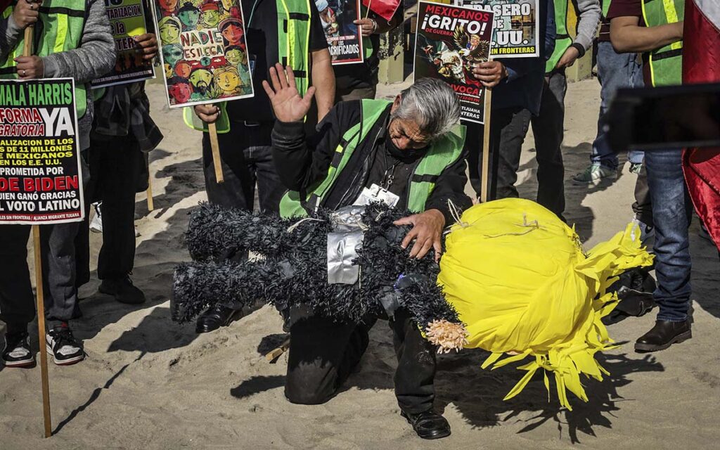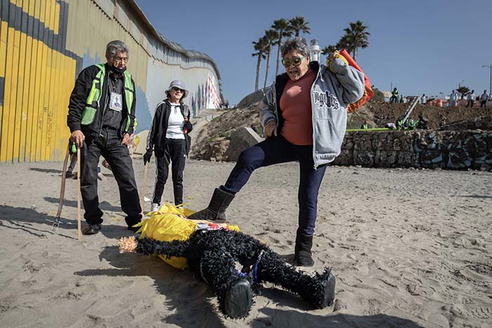 Las manifestantes, entre los que se encontraban personas deportadas de Estados Unidos en los meses recientes, se reunieron en la zona de la playa, donde el muro fronterizo desemboca en el mar del océano Pacífico, un lugar muy representativo para la población migrante, en donde los activistas también llevaron una piñata con las características de Trump, a la que de manera simbólica le dieron nalgadas y cinturonazos en alusión “a su actitud de niño malcriado”, dijo Sergio Tamai, director de la organización Ángeles Sin Fronteras.