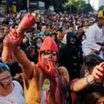 Miles de personas caracterizadas como zombies, con la cara maquillada con llagas ensangrentadas, con pupilentes en color blanco, rojo, las ropas raídas, manchadas de rojo simulando sangre, se concentraron en el Monumento a la Revolución.