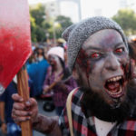 Muchos participantes vestidos como personajes de películas como Jack Sparrow, el payaso Eso, otros más de clérigos, militares, monjas, todos infectados de la fiebre zombie.