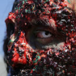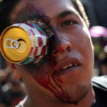 Ataviado con una sudadera amarilla rota y la boca negra, el peculiar personaje detalló que en esta décima edición de la marcha zombie la causa fue reunir alimentos, enseres y artículos de uso personal para los damnificados de los terremotos.