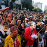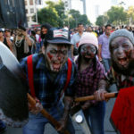 Los zombis invadieron este sábado las calles del Centro Histórico por décimo año consecutivo, pero esta vez la terrorífica marcha tuvo como propósito ayudar a los damnificados de los sismos de los días 7 y 19 de septiembre.