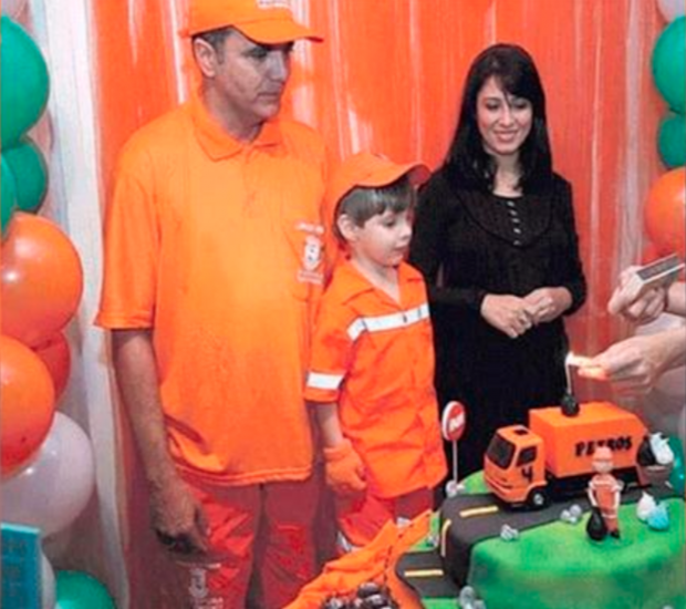 Además, todo el lugar donde se realizó la fiesta fue adornado de color anaranjado, con algunos contrastes en verde y, un pastel que retrataba el momento en que su padre sale con su camión a las calles, para recoger los desperdicios.