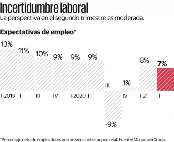 Una vez realizado el ajuste estacional, la expectativa neta de empleo, es decir, el porcentaje de empleadores que prevé contratar personal en el segundo trimestre del año es de apenas 7%, el nivel más bajo para dicho trimestre desde 2009.