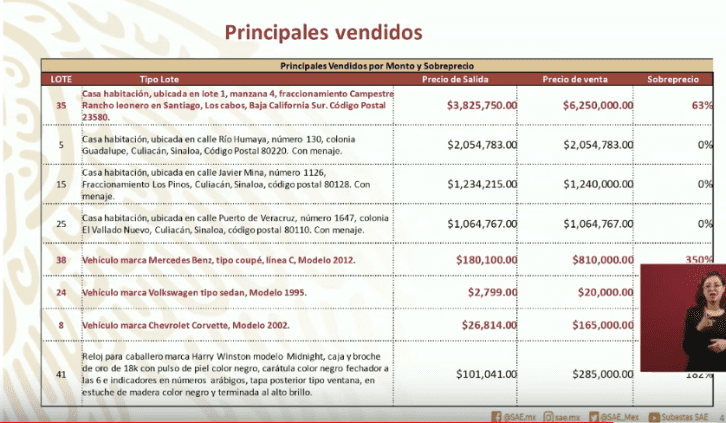El Servicio de Administración y Enajenación de Bienes dio a conocer que de los 45 lotes listos para la subasta se vendieron 37 por un total de $16,208,507 que representa el 82%.