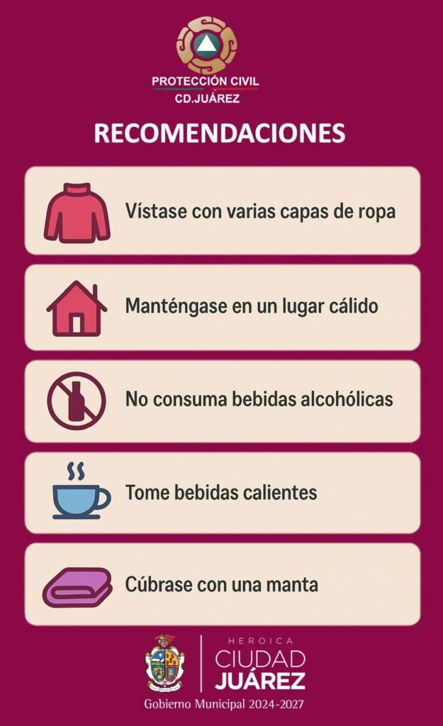 Las temperaturas esperadas para este día son (máx/min °C): Juárez 17/-1, Janos 17/-3, Chihuahua 16/2, Madera 15/-4, Cuauhtémoc 14/-3, Ojinaga 19/3, Delicias 19/2, Camargo 19/2, Jiménez 18/2, Parral 16/1, Creel 14/-5.