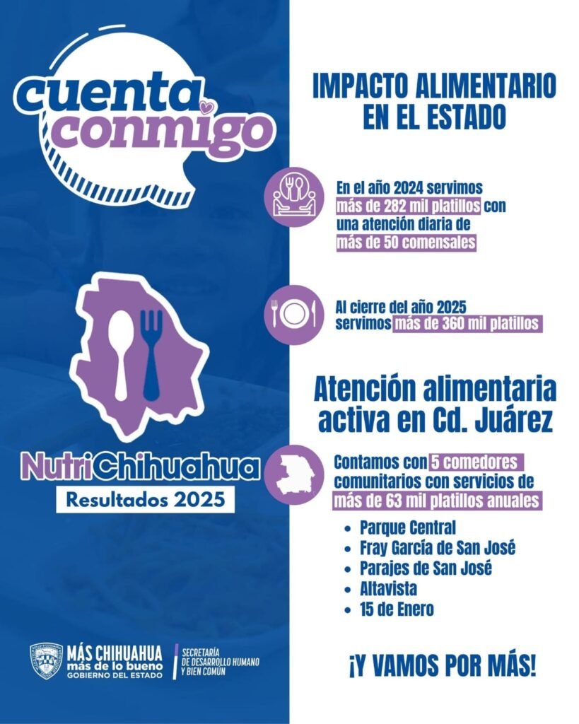 En Ciudad Juárez, NutriChihuahua mantiene activa una red de apoyo integrada por cinco comedores comunitarios, los cuales brindan más de 63 mil platillos al año. Estos espacios se ubican en el Parque Central, Fray García de San José, Parajes de San José, Altavista y la colonia 15 de Enero, beneficiando de manera directa a cientos de personas.