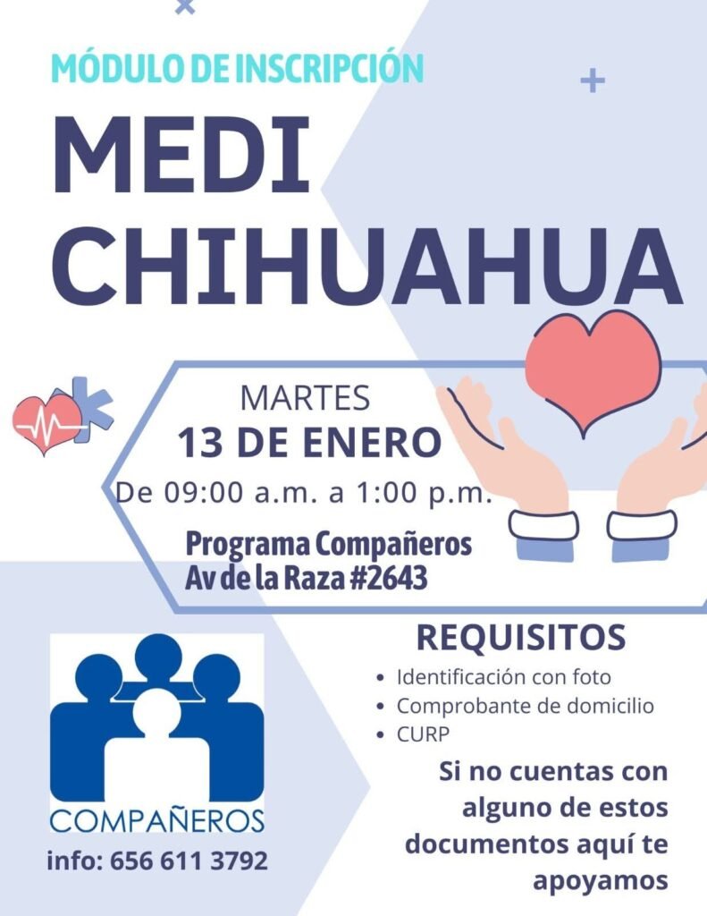 El Programa Compañeros invita a la ciudadanía a participar en su próxima jornada de atención, donde se contará con el Módulo de Inscripción MEDI Chihuahua la cual tiene como objetivo brindar orientación y apoyo a las personas interesadas en integrarse al programa. Esta actividad busca acercar servicios y facilitar el acceso a trámites importantes para la comunidad.