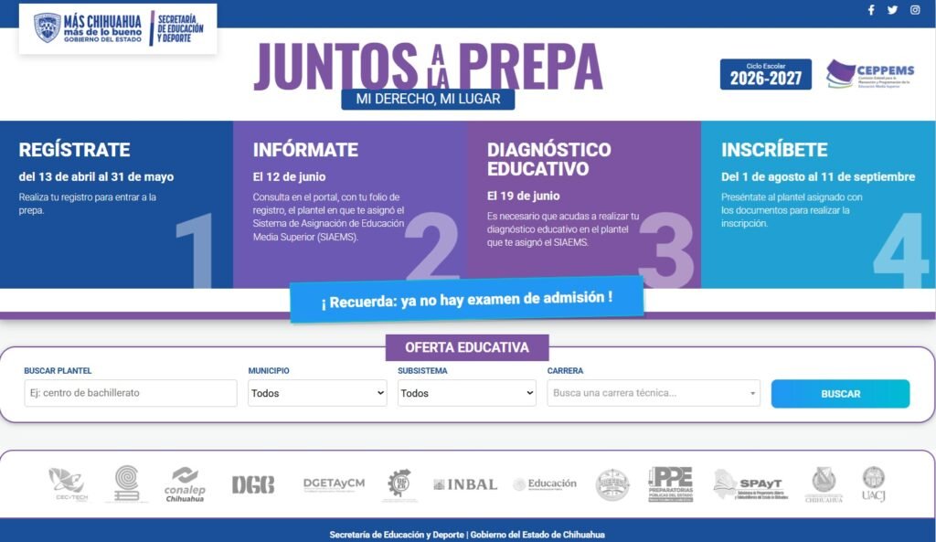 A partir del próximo 13 de abril dará inicio el proceso de registro para quienes buscan ingresar a planteles públicos de Educación Media Superior en Ciudad Juárez y el resto del estado, correspondiente al ciclo escolar 2026–2027. La convocatoria forma parte de la estrategia “Juntos a la Prepa. Mi Derecho, Mi Lugar”, mediante la cual se busca garantizar un espacio educativo a los estudiantes que concluyen su educación básica.