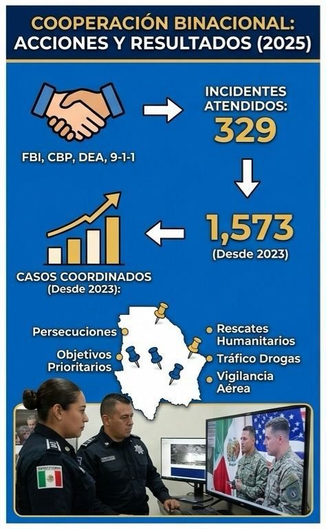De acuerdo con información oficial, durante 2025 se atendieron 329 incidentes fronterizos en coordinación directa con instancias estadounidenses como el Federal Bureau of Investigation (FBI), la Patrulla Fronteriza (CBP), la Drug Enforcement Administration (DEA) y el sistema de emergencias 9-1-1 de El Paso, Texas.