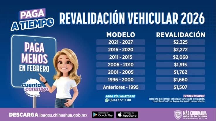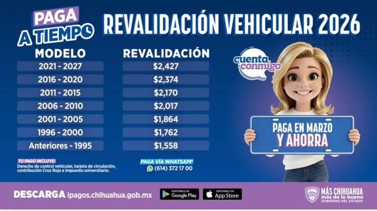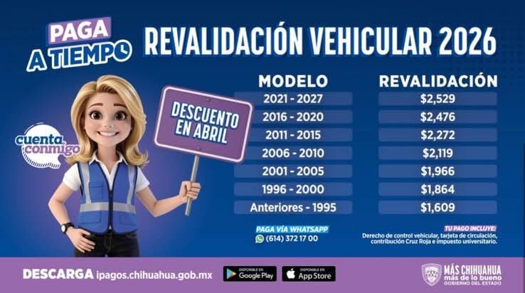 El funcionario recordó que el pago de la revalidación integra diversos conceptos, entre ellos el derecho de control vehicular, la tarjeta de circulación, la aportación a la Cruz Roja y el impuesto universitario. Asimismo, destacó que el proceso puede realizarse de manera ágil a través del portal ipagos.chihuahua.gob.mx, la aplicación móvil oficial y el servicio habilitado vía WhatsApp.