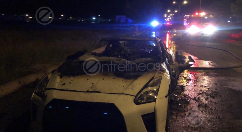 Se trata de un vehículo Nissan GT-R modelo 2018, el cual ardió en llamas al parecer por un problema eléctrico.