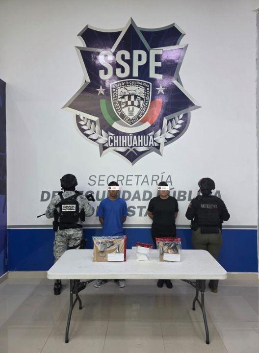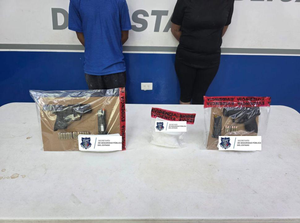 Al realizar una inspección preventiva, se localizaron dos armas de fuego cortas, 19 cartuchos y una bolsa con 245 gramos de sustancia cristalina similar a la metanfetamina, motivo por el cual se procedió a la detención de Claudia Nallely “N”, de 34 años, y Eduardo “N”, de 20 años.