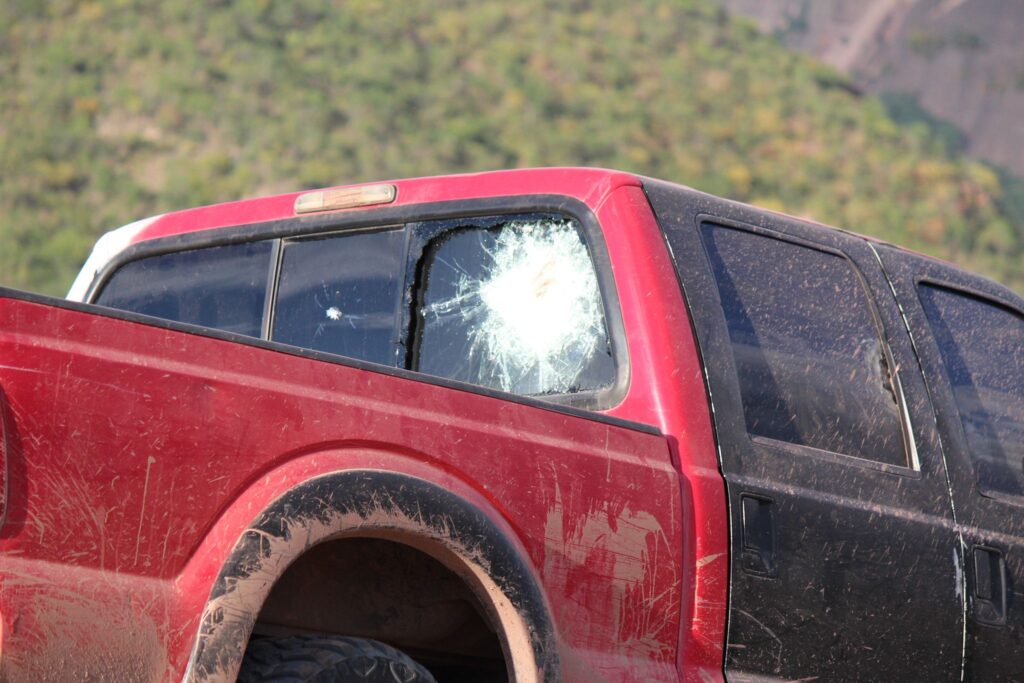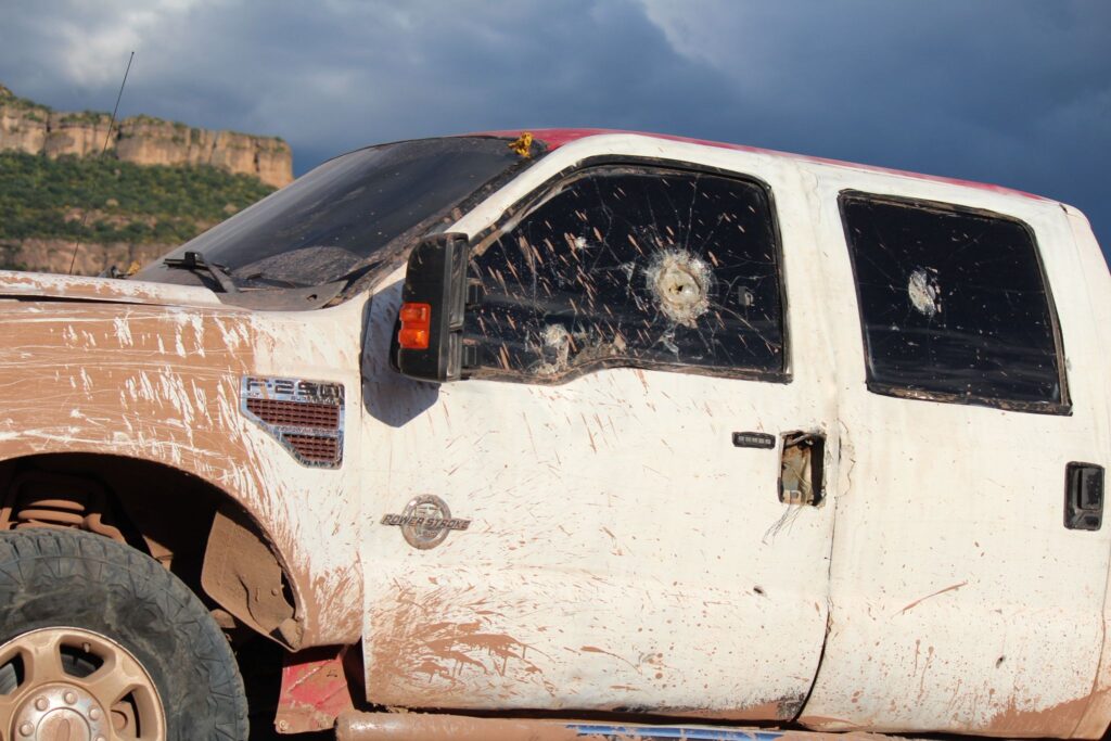 Durante la inspección, algunos vehículos presentaban impactos de arma de fuego de alto calibre, además de que uno de ellos, una Super Duty, contaba con insignias alusivas a un grupo criminal sobre una de sus puertas.