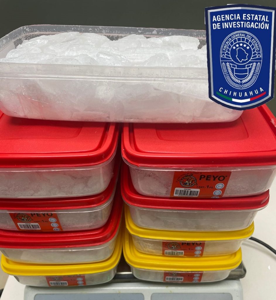 Elementos de la Agencia Estatal de Investigación, a través del Centro de Operaciones Estratégicas, capturaron en Ciudad Juárez a dos sujetos a quienes se les encontraron recipientes con 9.928 kilogramos de la droga conocida como cristal y 4.068 de fentanilo en pastillas.