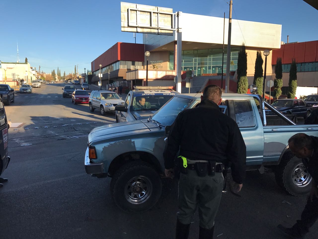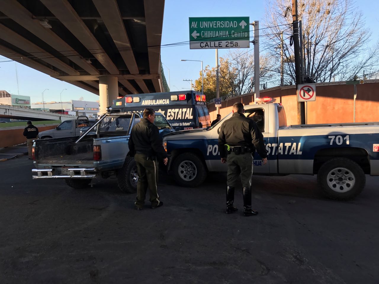Los involucrados fueron una Chevrolet Silverado acondicionada como patrulla número 701 de la PEU, cuyo guiador descendía por la calle 25 de norte a sur, y en el cruce de cuatro altos chocó en un costado a una Nissan pick up de modelo atrasado que circulaba sobre la lateral de la avenida Teófilo Borunda.