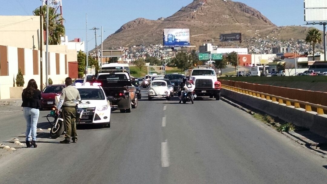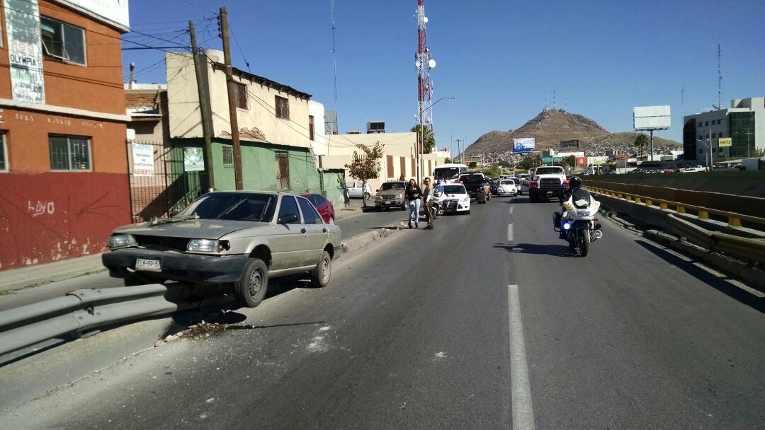 Agentes de vialidad se movilizaron hacia el canal Teófilo Borunda por el choque de un Nissan Tsuru con placas ELK5957 que dejó caos vial y cuantiosos daños materiales.