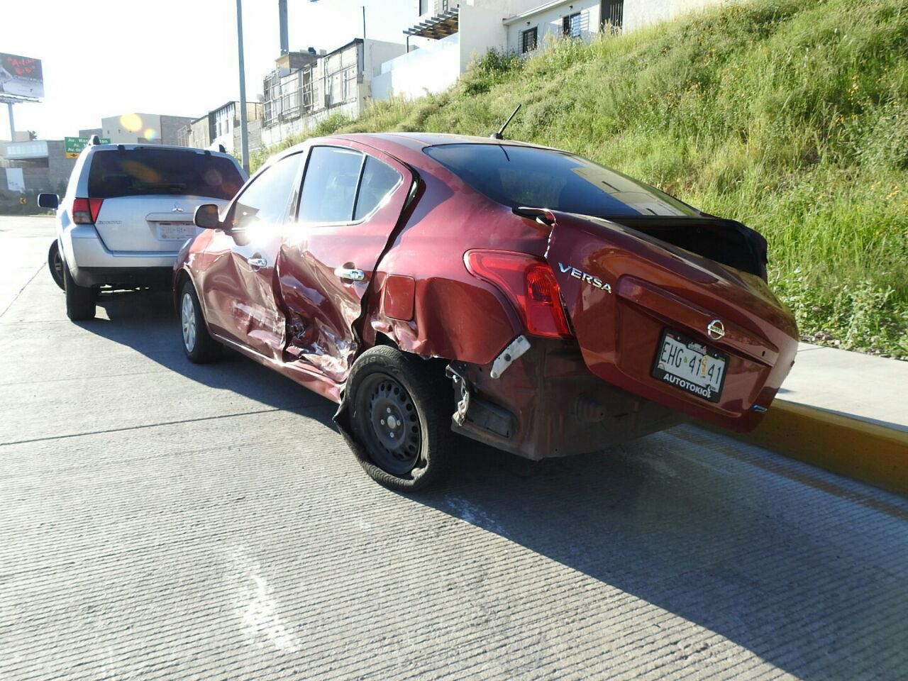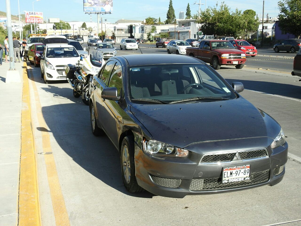 Debido a ello, chocó contra un Nissan Versa de modelo reciente y matrículas EHG-4141, el cual derribó un poste y se impactó contra un Mitsubishi Lancer con placas ELM-9789.