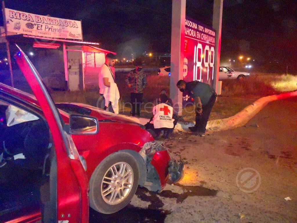 Dos personas lesionadas fue el saldo de un fuerte choque en avenida Los Arcos, en donde un vehículo se impactó contra la base de un anuncio de una gasolinera.