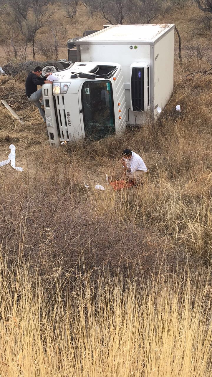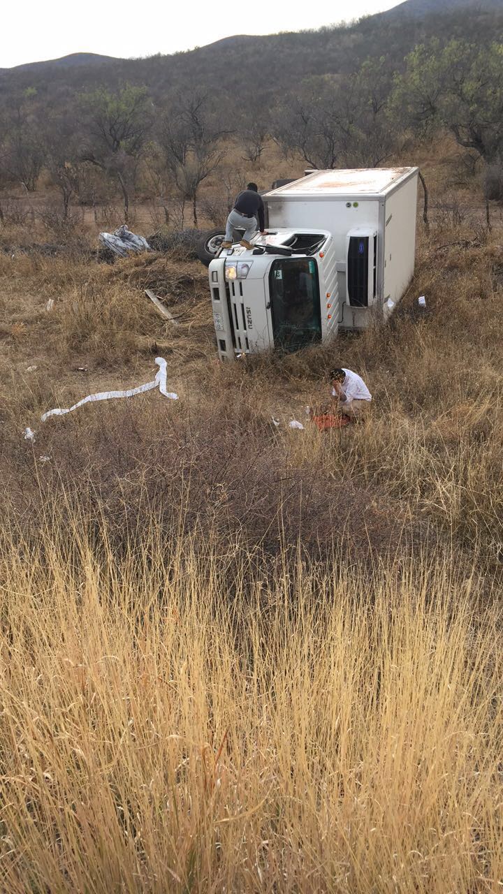 Este lunes se registró una volcadura a la altura del kilómetro 60 de la carretera a Parral, protagonizada por un camión de una empresa de alimentos.