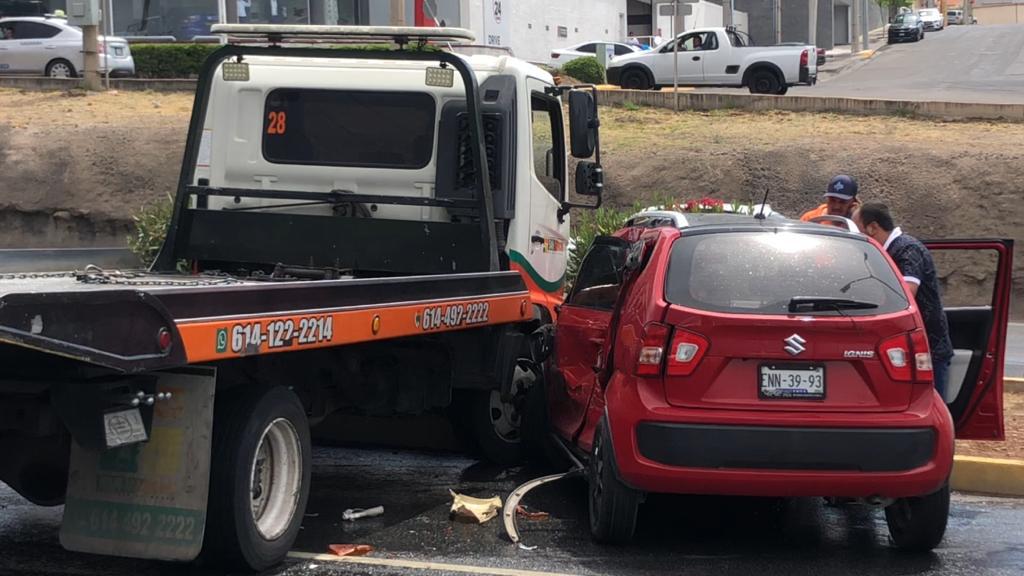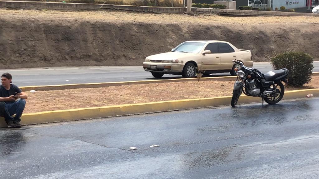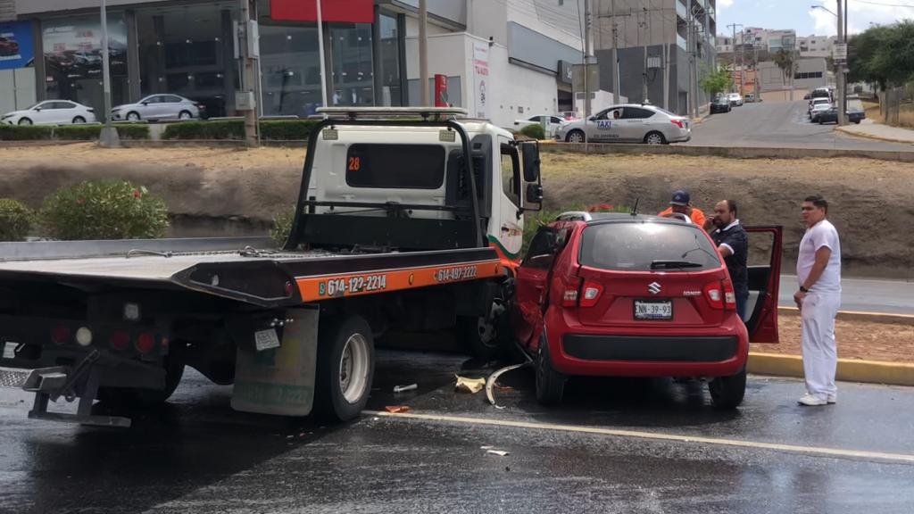 Más adelante en el mismo periférico de la Juventud y Mirador se dio otro choque esta vez el chófer de una motocicleta negra susuki 125cc derrapo por el asfalto mojado y es impactado por un vehículo Ignus Suzuki color rojo que a su vez es proyectado por una grúa de San Marcos.