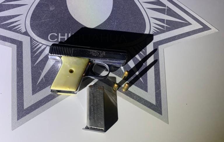 Además, tras una inspección, se les localizó un arma de fuego corta modelo MP-25 calibre .25 ACP y un cargador abastecido con tres cartuchos útiles del mismo calibre.