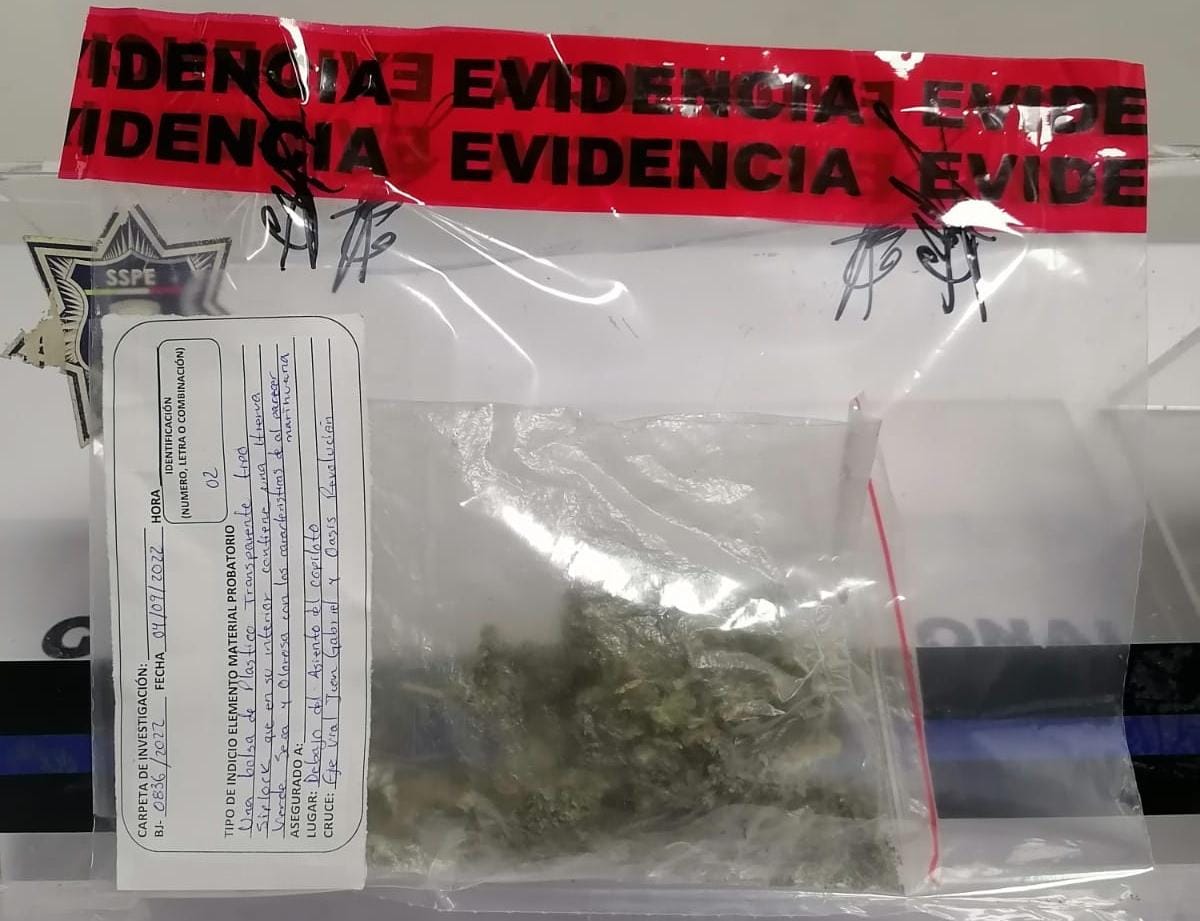 Elementos de la Secretaría de Seguridad Pública del Estado (SSPE), detuvieron en calles de la colonia Oasis Revolución, en Ciudad Juárez a 4 jóvenes, uno de ellos menor de edad, a quienes se les aseguró un envoltorio con una hierba verde, seca y olorosa similar a la marihuana.