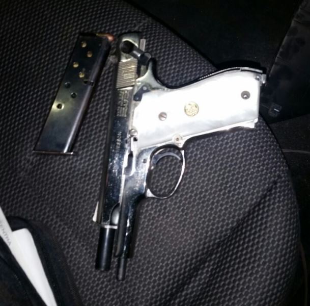 Durante la revisión les encontraron una pistola escuadra marca Smith y Wesson calibre .9mm con su respectivo cargador con cinco cartuchos útiles, además de bolsas trasparentes que contenían un polvo blanco y granulado con propiedades de metanfetamina cristal, con un peso de 4 gramos.
