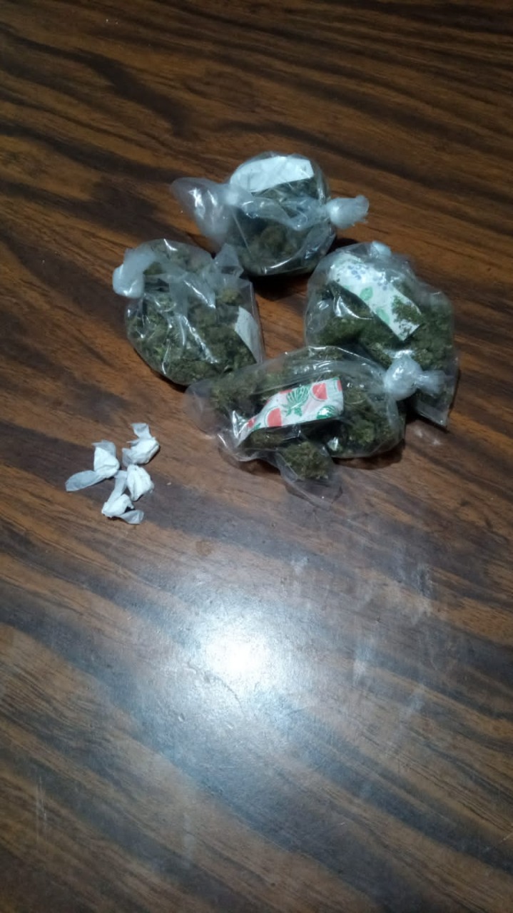 Al darle alcance, los elementos de la SSPE realizaron una inspección y localizaron dentro de una mochila de su propiedad, cuatro paquetes de una hierba verde, seca y olorosa, así como cuatro envoltorios de un polvo blanco y refinado con las características propias de la marihuana y la cocaína respectivamente.
