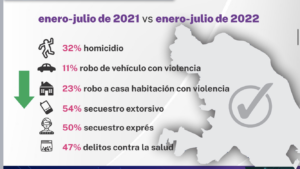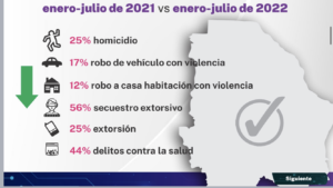 A nivel estatal, los homicidios disminuyeron un 25 por ciento, 17 por ciento el robo de vehículo con violencia, 12 por ciento el robo a casa habitación con violencia, 56 por ciento el secuestro extorsivo, 25 por ciento la extorsión y 44 por ciento los delitos contra la salud.