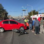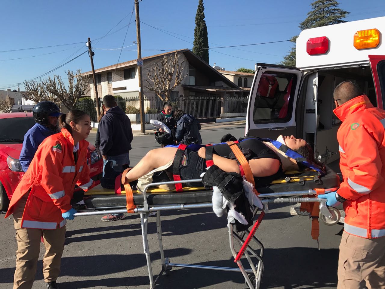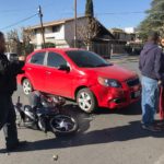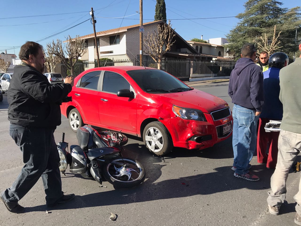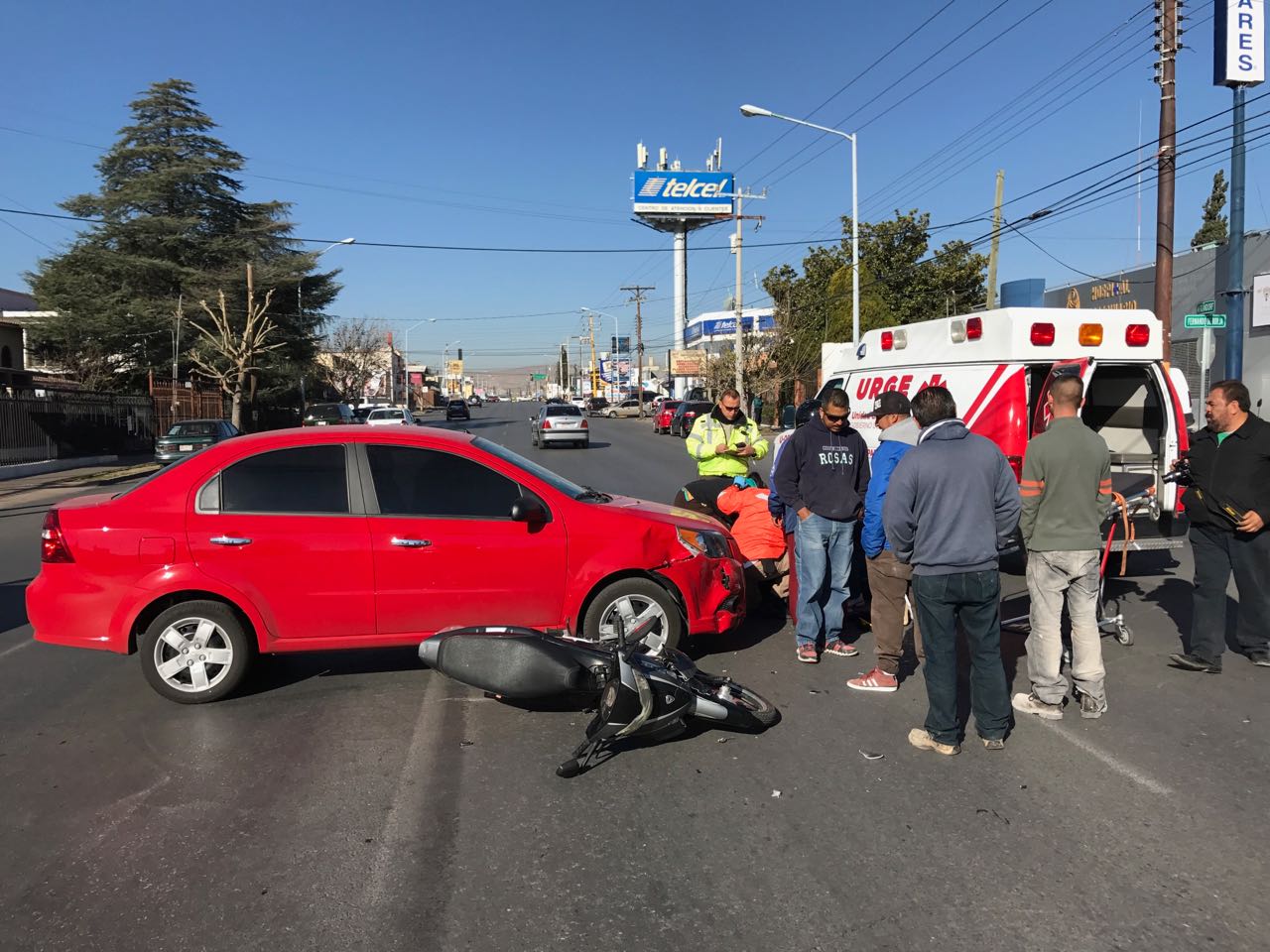 Una mujer que circulaba a bordo de su motocicleta fue embestida por la conductora de un vehículo de modelo reciente en calles de la colonia San Felipe, lo que le provocó lesiones a la guiadora de la moto.