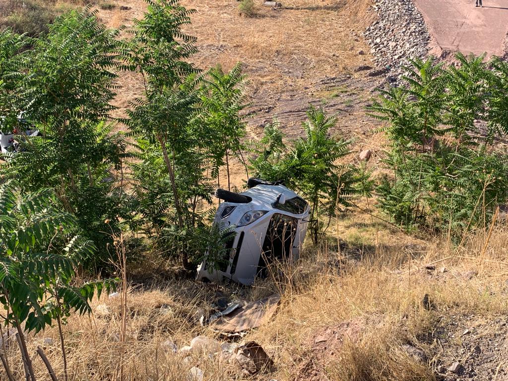 Se trata de un vehículo Chevrolet spark blanco, el cual circulaba por una rampa de acceso de R. Almada a Silvestre Terrazas cuando se va incorporar a la salida a Cuauhtémoc no se percata que viene un vehículo, trata de evitar el choque y sale del camino cayendo a un barranco de más 5 metros.