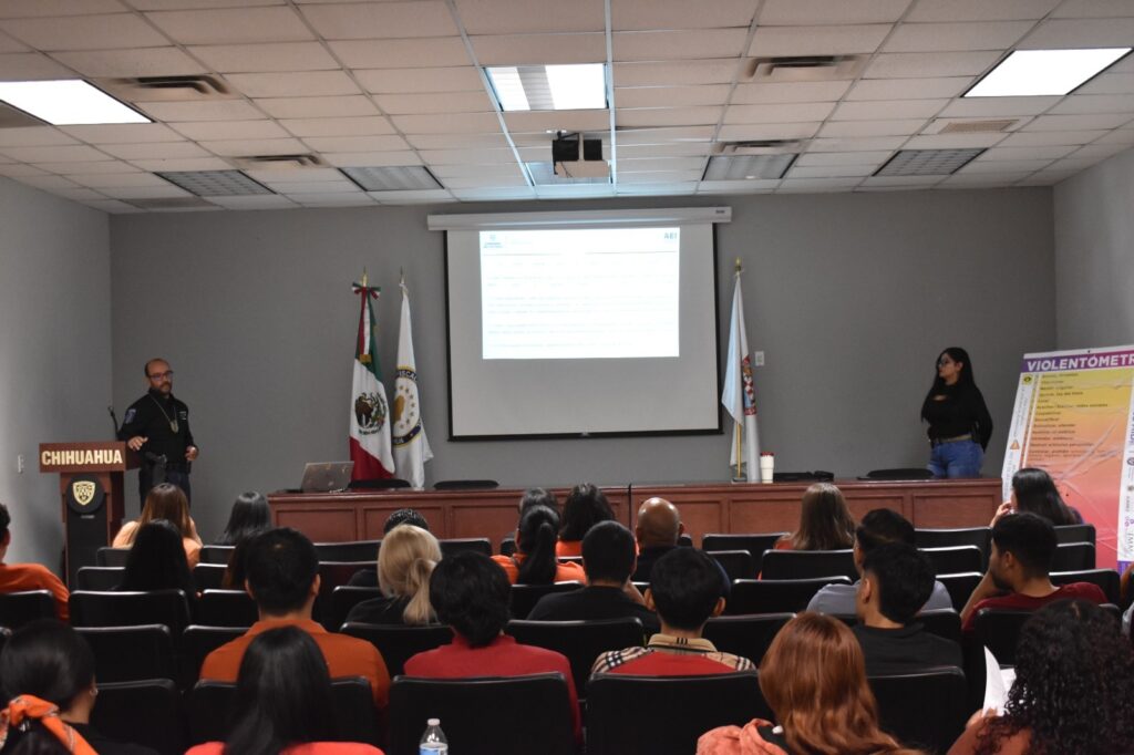 Elementos del Grupo de Orientación Escolar Chihuahuense (GOECHI), de la Agencia Estatal de Investigación, impartieron una plática a 40 alumnos de las carreras de Criminología, Derecho, Políticas Públicas y Ciencias de la Seguridad, quienes compartieron sus puntos de vista con los comandantes y coordinadores de la Comisión Ejecutiva y de la Unidad Especializada en Delitos de Feminicidios, de la Fiscalía Especializada en Atención a Mujeres Víctimas del Delito por Razón de Género y a la Familia (FEM).