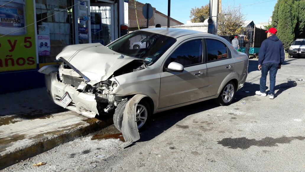 Debido a ello, el Aveo salió proyectado hacia la banqueta y una mujer que ahí viajaba resultó con lesiones.