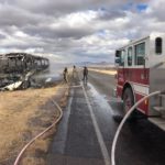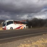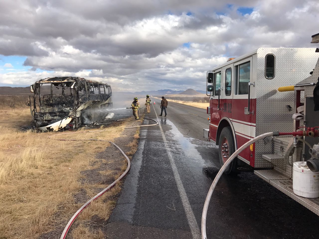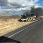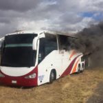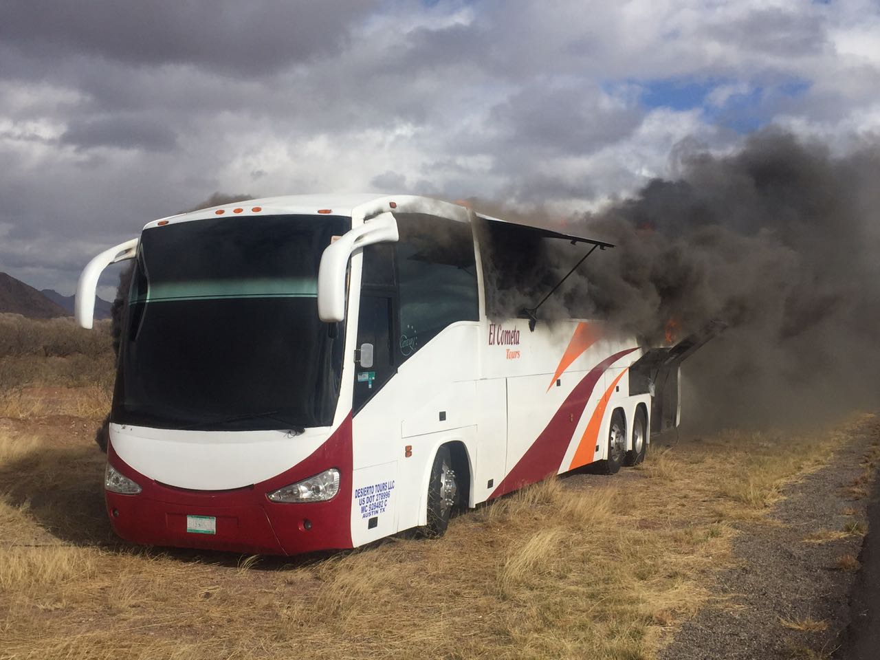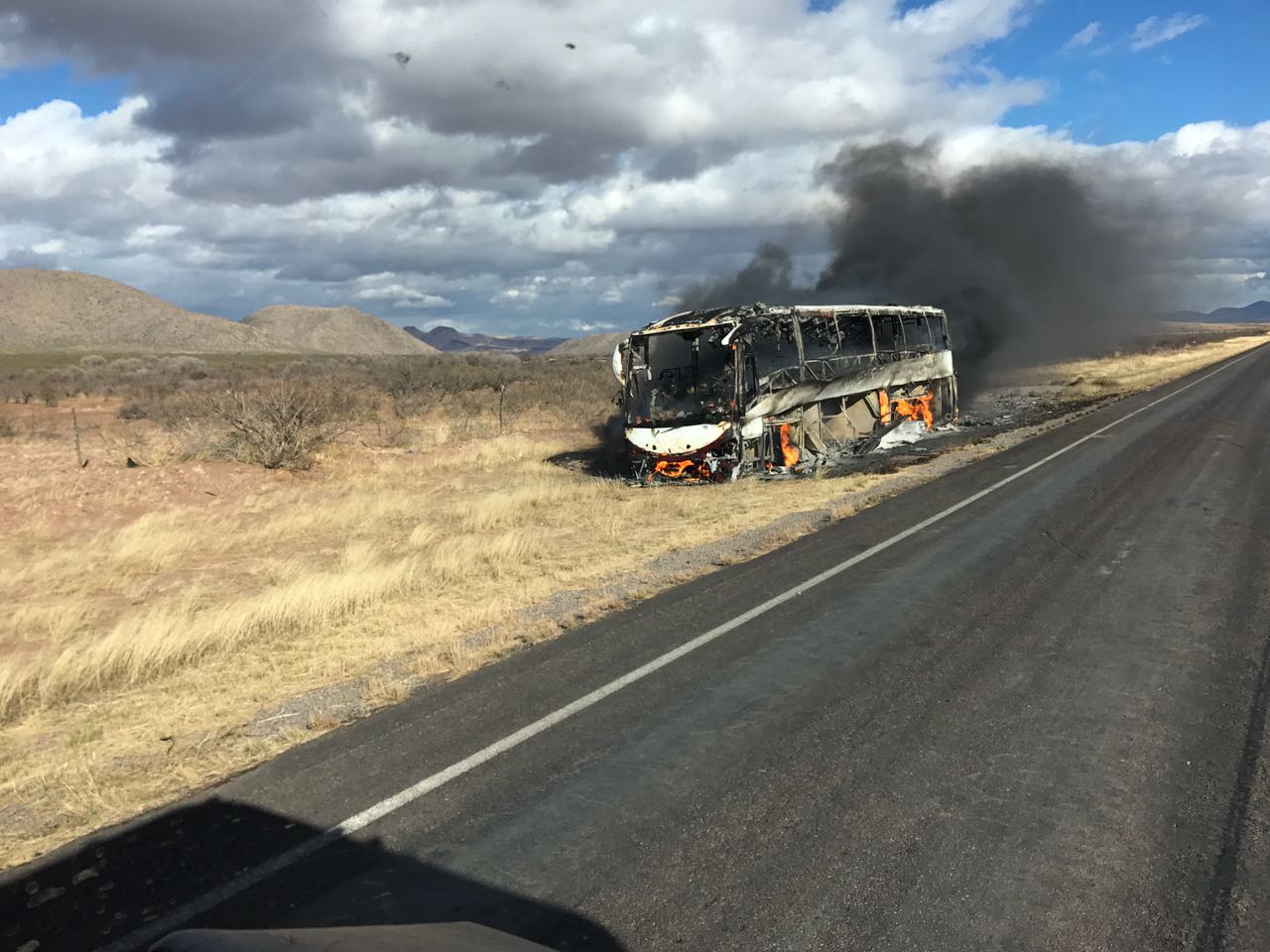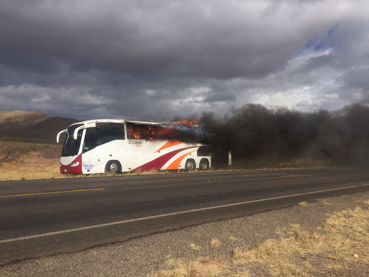 Elementos de la Policía Estatal reportaron un incendio de un camión de pasajeros en la carretera Flores Magón a Ojo Laguna.