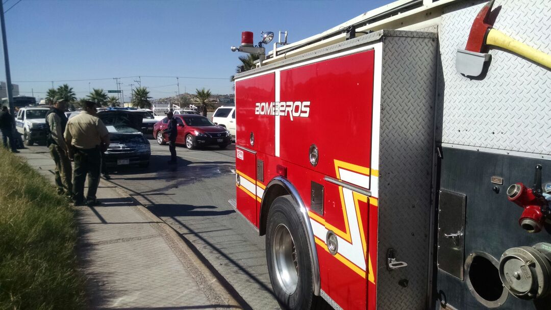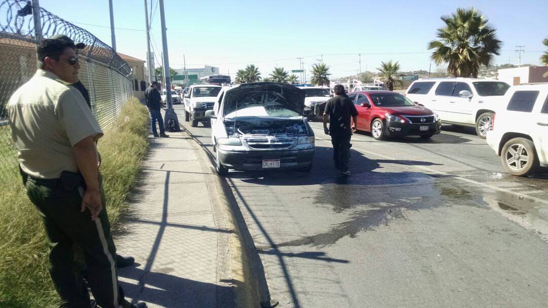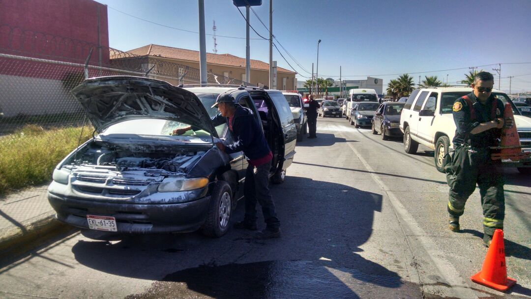 El percance ocurrió sobre la Vialidad Ch-P y avenida Pacheco, donde el conductor de una Dodge Caravan con placas de circulación EKL 6135 se incendió en el área del motor.