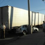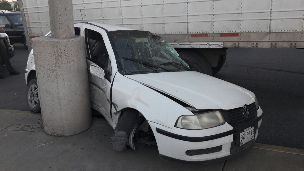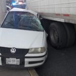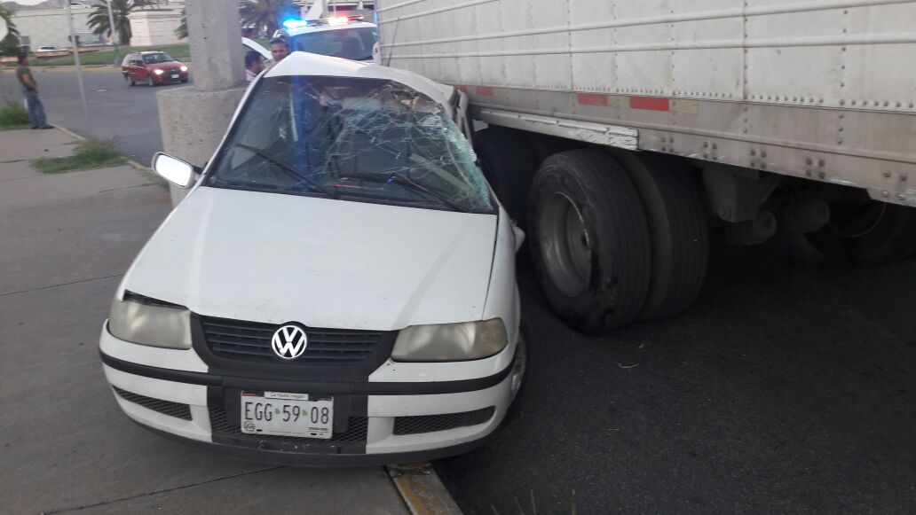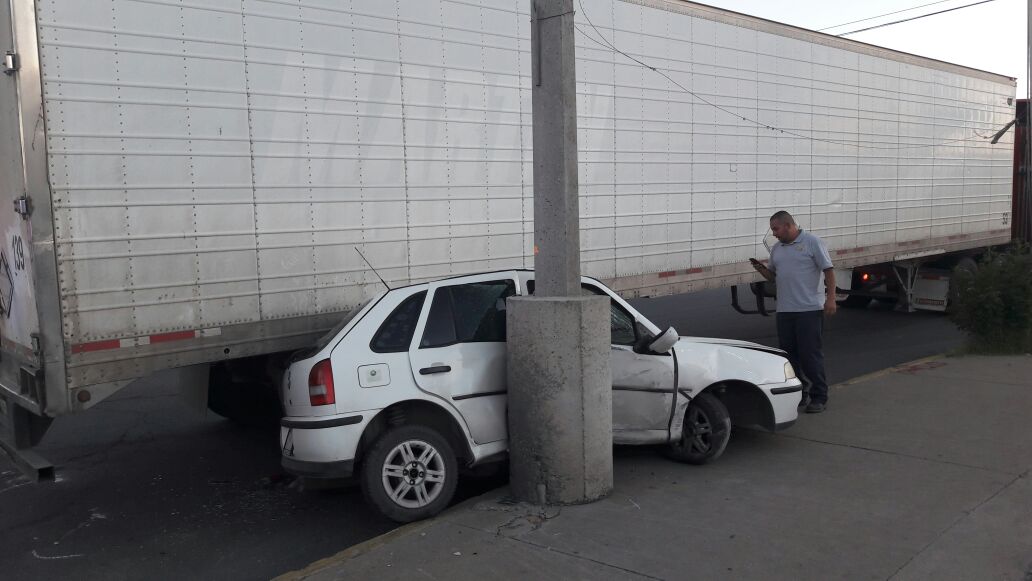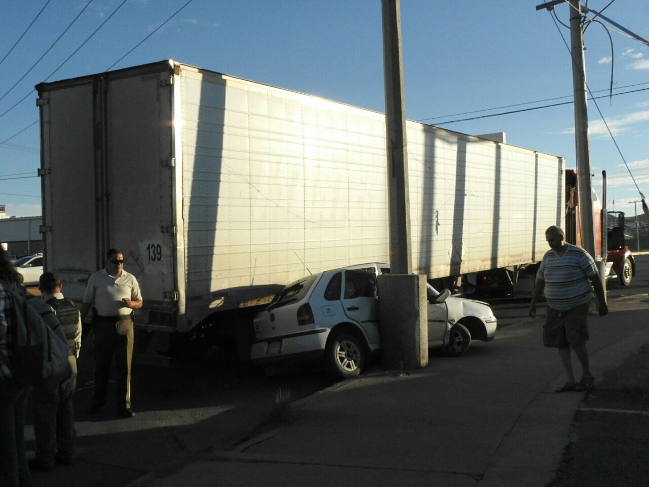 Los involucrados son un tráiler y un automóvil VW Pointer, con placas de circulación EGG-5908, el cual quedó prensado.