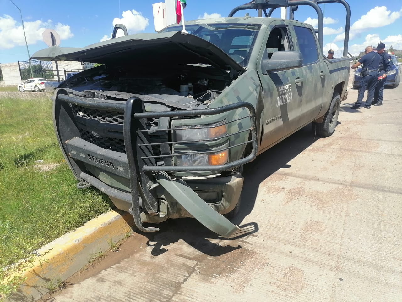 *Vehículo 1* Se trata de una pick up, marca Chevrolet, línea Cheyenne, color verde pixelada, modelo 2014, sin placas, conducida por Eduardo A.M., de 23 años de edad, la unidad cuenta con seguro y presenta daños por 100 mil pesos.