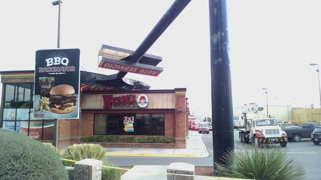 Uno de los espectaculares dañó a dos vehículos, una Tacoma 2007 y un Jetta 2005 en la Pacheco y Rosales, mientras que otro cayó sobre el restaurante Wendy’s de la Francisco Villa y Juventud.