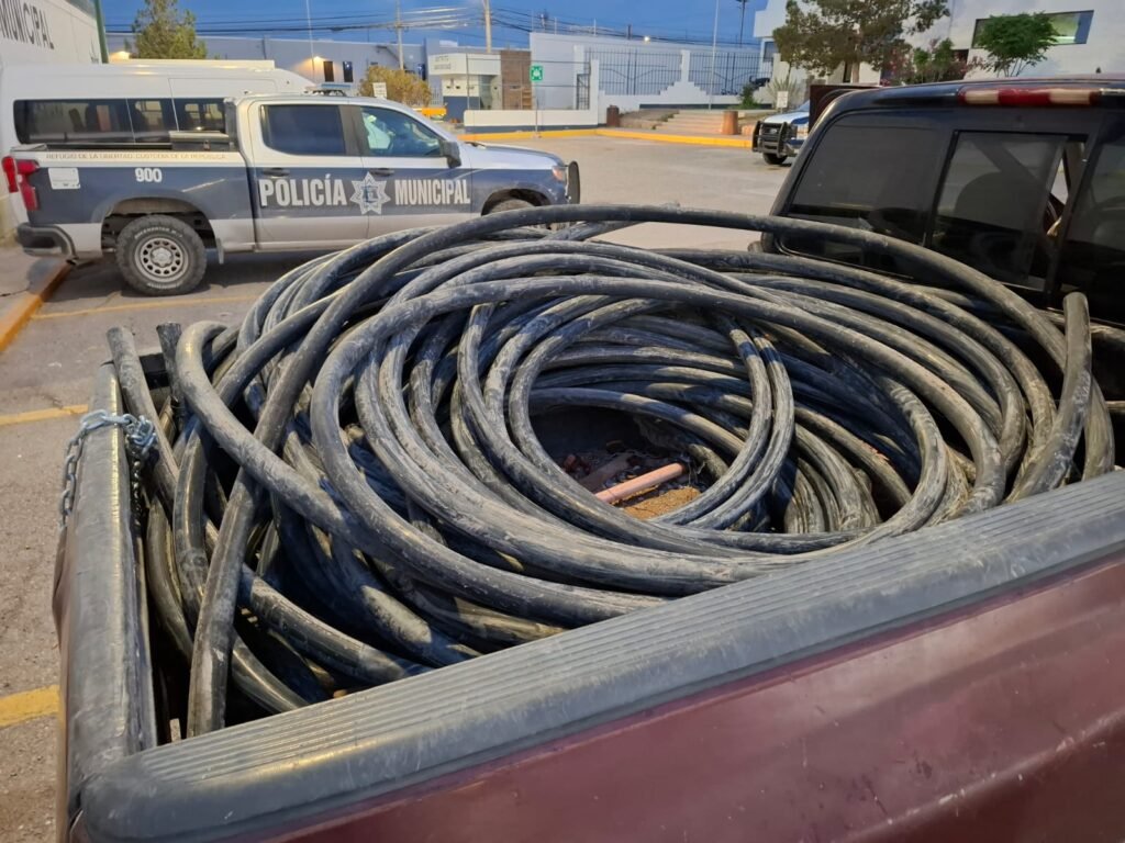 Al arribar, los agentes observaron a tres individuos jalando cableado de internet, mismo que subían a una camioneta Ford F150, modelo 2003, en color guinda. Tras ser abordados, los sujetos fueron detenidos y se les aseguró varios metros de cable grueso, así como una segueta utilizada para cortar el material.