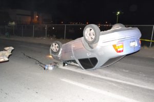 Una aparatosa volcadura se registró en la salida a Delicias, cuando un conductor ebrio perdió el control y cayó desde el distribuidor vial que se ubica a unos metros de la Puerta de Chihuahua. Según reportaron fuentes policíacas, el guiador circulaba a bordo de un automóvil Chevrolet Cavalier de modelo