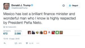 El candidato republicano a la Casa Blanca, Donald Trump, dedicó una serie de mensajes en Twitter al ex titular de la SHCP, Luis Videgaray, a quien consideró un funcionario “brillante”, informó SDP. A unas horas de haber considerado como “un triunfo” de su campaña la renuncia de Videgaray Caso al