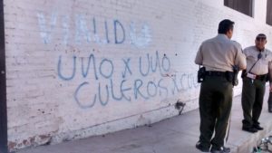 En un gimnasio ubicado frente a la clínica Ávalos, se denunció una pinta que amenazaba a agentes de Vialidad. Con pintura de aerosol fue escrito el mensaje por lo que vecinos del lugar la tuvieron que borrar por las palabras altisonantes. De acuerdo con el mensaje que tuvo que ser