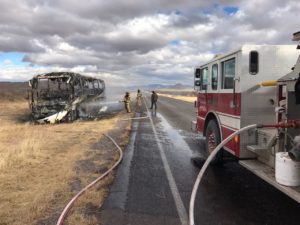 Elementos de la Policía Estatal reportaron un incendio de un camión de pasajeros en la carretera Flores Magón a Ojo Laguna. El autobus, marca Ibiza y con placas de circulación 815RM7, comenzó a incendiarse por un corto en el sistema eléctrico, siniestro que consumió en su totalidad el vehículo.