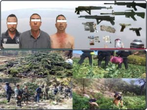 Derivado de las acciones implementadas por los integrantes de las Bases de Operación Mixta (BOM) en diferentes zonas del estado, en una semana se tuvieron los siguientes resultados. Localizaron y destruyeron dos plantíos de droga, decomisaron dos mil kilogramos de marihuana en greña, 36 gramos de cocaína, cuatro armas largas