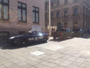 Elementos del Ejército Mexicano y de la Policía Federal resguardaron el Palacio de Gobierno por la reunión de la mesa interinstitucional de seguridad que se realizó esta mañana para abordar temas referentes al Grito de Independencia. Hasta el momento no se ha informado sobre el número de elementos que participarán